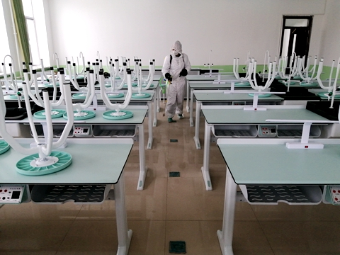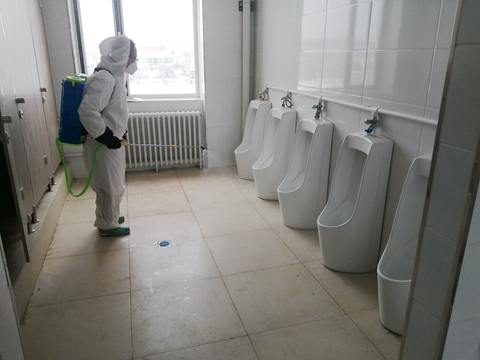 学校保健老师定期到教学楼内进行一次消毒。寒假期间,学校教学楼内还有工人对尚未完成维修施工的任务进行施工。同时,有部分教师到教学楼内培训办公。李兴平老师定期对教学楼和门卫室进行一次全面消杀,确保校园卫生安全。